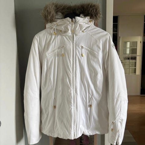 Valkoinen naisten lasketteluasu koko 40. Takissa on pitkä hiha ja se on valmistettu ulkokäyttöön soveltuvasta materiaalista. Takki soveltuu erilaisiin ulkoilma-aktiviteetteihin ja tarjoaa suojaa sääolosuhteilta.