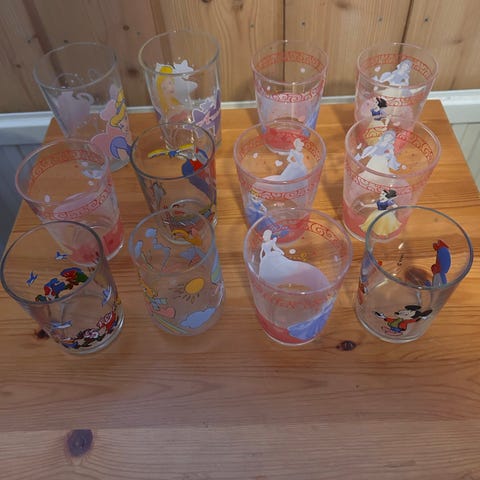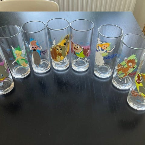 Kuvan lasipurkit, disney-aiheinen jossa tutut hahmot urheilemassa, voidaan myös käyttää kukkamaljakkona tai kaatimena, kannuna.