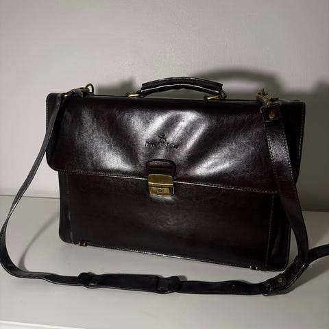 Nahkainen unisex-olkalaukku, ruskea. Laukussa on säädettävä olkahihna, kaksi etuläpän magneettisia solkikiinnitystä ja useita sisä- ja ulkotaskuja. Ulkomitat noin 47x33x10, joten sisään mahtuu helposti 13” tietokone tarvikkeineen. Kunto erittäin hyvä, vaikka käytön jälkiä on antamassa laukulle luonnetta.