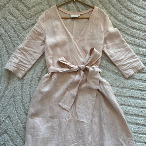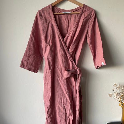 Keltainen kietaisumekko, Nakoa. Ei juuri käytetty. Pellavaa. Alunperin roosa, värjätty pesukonevärillä. Näistä ei saa hyvää kuvaa hengarissa, mutta siis Nakoan upeaa laatua!