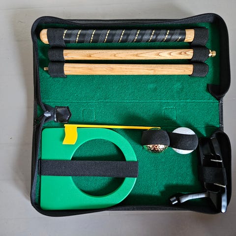 Stiga Open Table Top Golf Game sisältää pelilaudan ja golf-aiheiset peliosat, kuten puita, palloja ja mailoja. Peli on tarkoitettu pöytäpeliksi ja simuloimaan golf-kokemusta pienoiskoossa. Pakkaus sisältää ohjeet pelin pelaamiseen useilla kielillä.