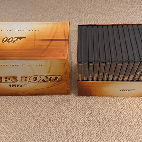 Myyntiin 007 -elokuvasalkku, joka sisältää 20 James Bond -elokuvaa. N 1/3 elokuvista on vielä muoveissa. Salkussa ulkopuolella muutama jälki, muuten siisti ja toimiva.