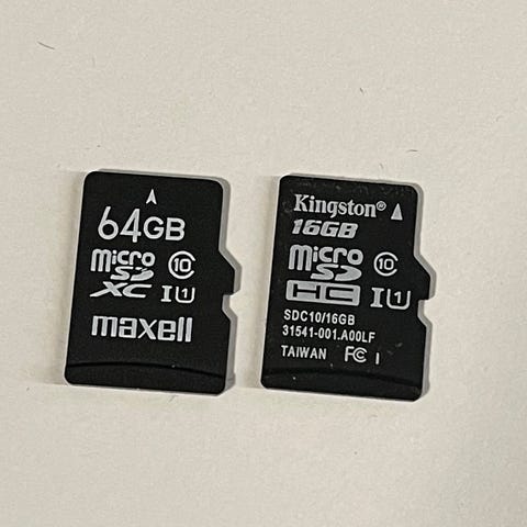 Sony MicroSDHC muistikortti, 32GB tallennuskapasiteetilla sekä toinen, jossa ei merkki näy.