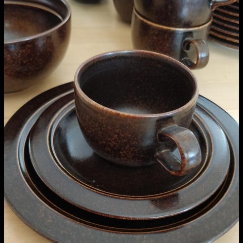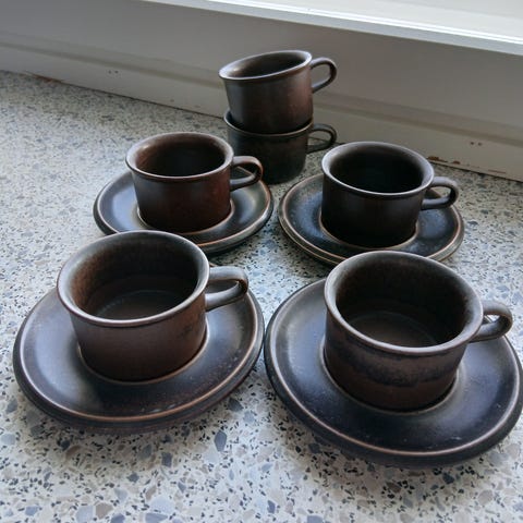 Arabia Ruska kahvikannu ja neljä kahvikuppia ja aluslautasta. Kolme ylimääräistä aluslautasta. Nouto Pakilasta.