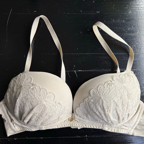 Japanilaisen Tutuannan kermanvalkoiset rintaliivit. Koristeluna kaunis pliseerattu sifonki, pieni pitsiaksentti, ja hempeän vaaleansininen rusetti . Irroitettava toppaus. Hyväkuntoiset, ei moitittavaa. Koko B75.