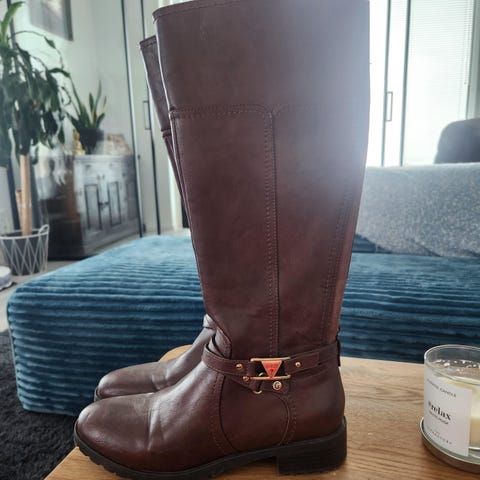 Naisten GUESS upeat, mustat nahkasaappaat, koko 40. Erittäin hyvässä kunnossa. Korko on 11 cm. Saappaissa on korkea varsi ja korollinen malli. Materiaali on aitoa nahkaa, ja niissä on koristeelliset soljet sivuilla. Saappaat soveltuvat käytettäväksi erilaisissa sääolosuhteissa ja asukokonaisuuksissa.