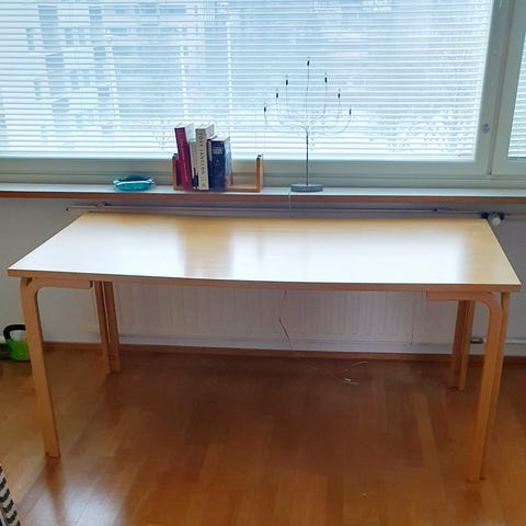 Iso ja tukeva valkoinen pöytä. Todella hyvässä kunnossa. Pöydän paksuus 4 cm. Leveys 160 cm, syvyys 90 cm, korkeus 76 cm.