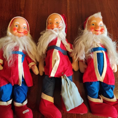 Olleet mm. aikoinaan jo kauan sitten edesmenneiden isovanhempieni kukkakaupassa Kauppahallissa koristeena. Oikeanpuoleinen hieman paremmassa kunnossa, vasemman puoleisen housut likaantuneet ja paidassa reikiä. Vain nouto.