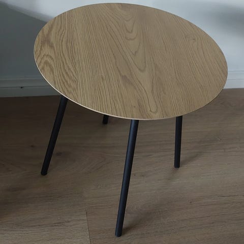 Pyöreä pöytä, jossa metallinen jalka ja musta kansi. Pöydän malli on yksinkertainen ja moderni, sopii erilaisiin sisustustyyleihin. Materiaalina metalli ja mahdollisesti lasi tai muu kova pinta kannessa. Käyttökelpoinen esimerkiksi ruokailu- tai työpöytänä.