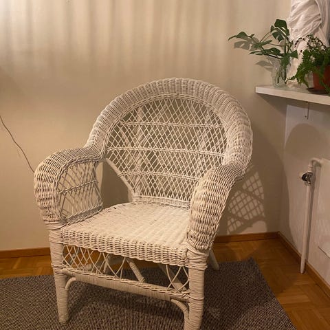 Rottinkituoli, jossa on hyvä istua. Vaatii puhdistusta ja uuden lakkauksen.