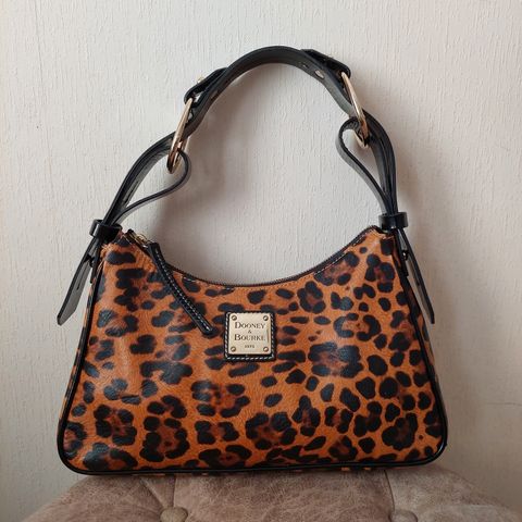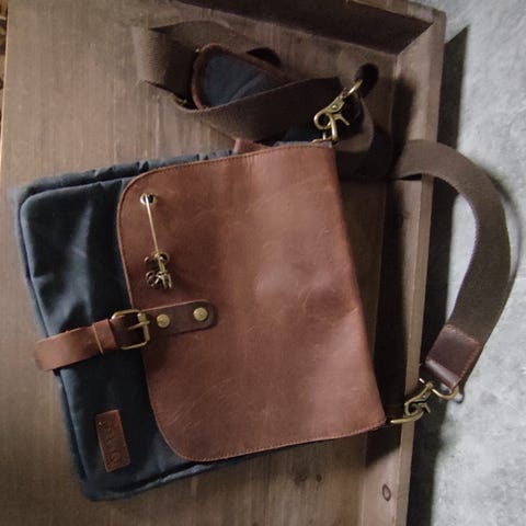 Kuin uusi. Tummanpunainen nahkalaukku. Ruskeaa nahkaa yksityiskohdissa, messinkiset helaosat. Ulkopuolella yksi nepparilla oleva tasku. Ruskea puuvillavuori. Sisällä yksi vetoketjutasku ja kiinteä nauha avaimille. Laukun suulla neppari. Valkoiset tikkaukset. Pohjan koko 25x19cm. Laukun korkeus 36cm. Hihnan pituus kokonaisuudessaan 41cm.
