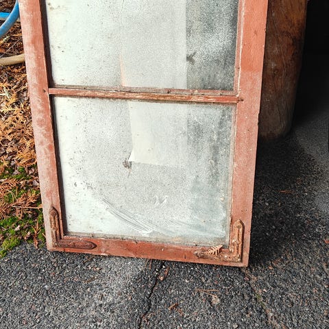 Somisteena ollut vanha ikkunanpoka, lasit paikallaa, koko 62 x 114 cm, koukut ja ketjut paikallaan