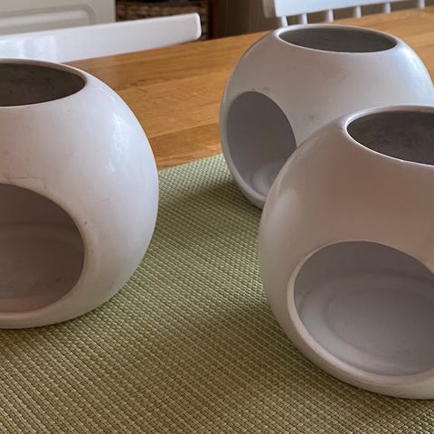 Uudet, käsintehdyt, väri vaaleanruskea. Valo kuultaa läpi. Isomman korkeus 15cm. Hinta yhteensä.