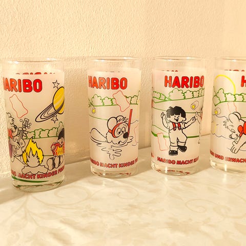 6 kpl siniset juomalasit, 1 kpl punainen juoma lasi, Marimekko aihe, kannu ja 2 kpl Minni Hiiri juomalasit