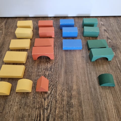 Puisia Hape rakennuspalikoita, noin 66 kappaletta. Palikoissa on vähän käytön jälkeä, mutta ovat hyvässä kunnossa. Yksi kolmioista on saanut osakseen isomman kolhun (kuva 3).