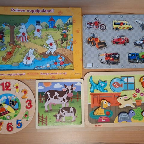 Vauvan pallossa pieni tahra. Muumipalikka palapeli lähes uusi tai ainakin palikat vähän leikityn näköisiä. Vauvan auto liikkuu itsenäisesti painattaessa. Uniriepu.