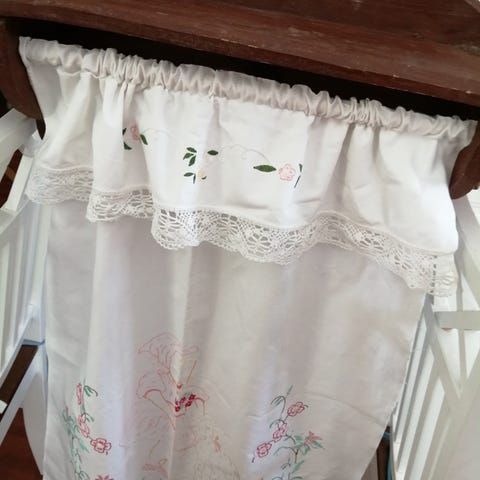 Käsitöinä kirjailtu pyheliinatelineen peite/verho. Tankokuja ja pitsireunus.