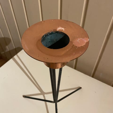 Kynttilänjalka esim lämpökynttilälle. Ostettu Stockmannilta 60-luvulla. Pakkauslaatikko tallella. Messinkinen jalka, kupu lasia. Lasikuvussa on ylhäällä kaksi pientä koloa (näkyy kuvassa). Korkeus n. 38cm, jalustan halkaisija 9cm, halkaisija ylhäältä 6cm.