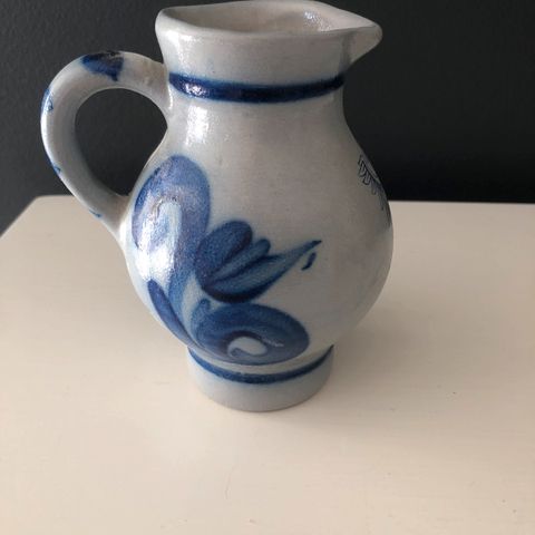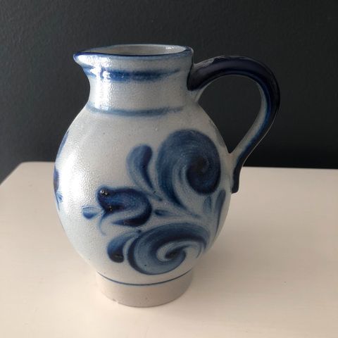 Vanha emaloitu kannu, keskellä kannua lohjennut pala n.2cm halkaisija, korkeus 27cm, halkaisija pohjasta 11cm. Kuvan mukainen. Hinta 25€/tarjoa.