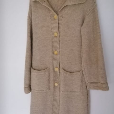 Ihana, luonnonvalkoisen/ harmaan sävyinen lämmin neule. Olen itse ostanut tämän valmiina, vaikuttaisi olevan käsin neulottua 100% hyvälaatuista villaa. Helman sivuilla pienet halkiot.
