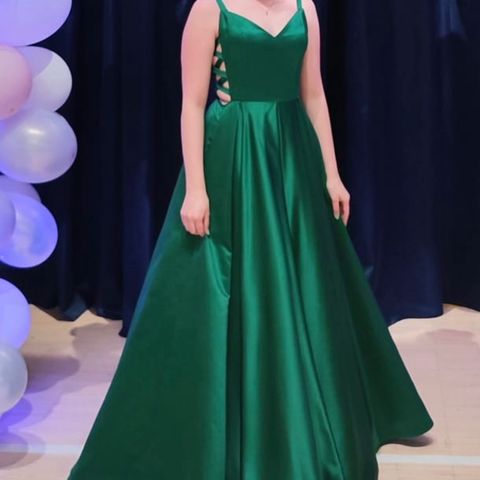 Kauniin vihreä, satiininen, tyylikkäällä leikkauksella oleva Zazabella Dazzling vanhojentanssimekko. Kerran käytetty, kuin uusi mekko. Koko on 32, mutta on isohkoa kokoa ja takana olevan kauniin nyörityksen avulla kokoa saa säädettyä paljon. Mekko on yltänyt 164cm pituisella tennareissa tanssineella lähes lattiaan saakka. Pukupussi (ovh 20) ja mekkoon suunniteltu vannehame (ovh 70) kuuluu hintaan.