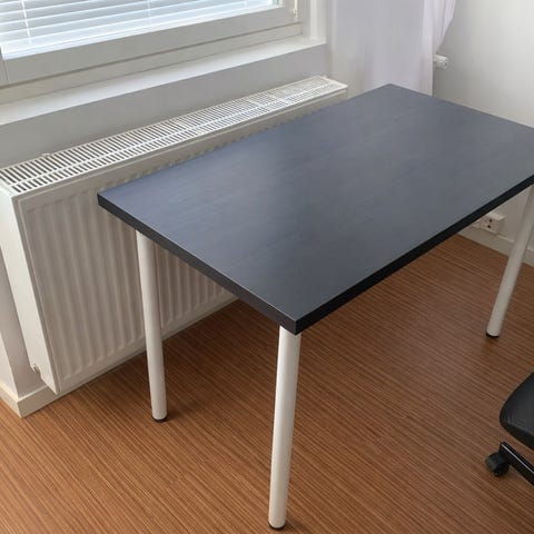 Kulmamuotoinen työpöytä, jossa on puu näköistä pinnoitetta ja useita säilytystiloja, mukaan lukien laatikko ja avohyllyt. Pöytä soveltuu toimistokäyttöön tai kotitoimistoon, ja sen muotoilu mahdollistaa tehokkaan tilankäytön. Alkuperäinen kokoaja ei ole käyttänyt liimaa, purkaminen lienee helppoa.
