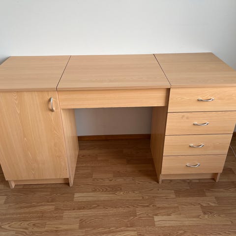 Työpöytä kulmaukseen. Suurimmat mitat n.155cm x 110cm. Puun näköistä päällystettyä lastulevyä.