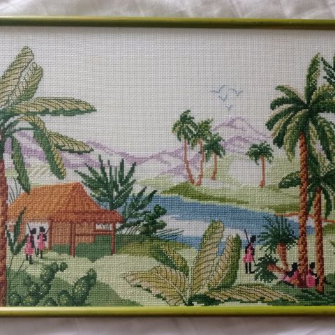 Neljä kappaletta ristipistotöitä kehyksissään.