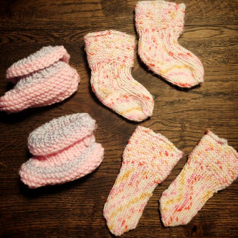 Vaaleanpunaiset villasukat ja tumput 0-1v. Tumpuissa ei peukalon paikkaa. Joitain kertoja ollut käytössä.
