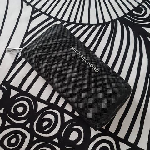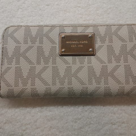 Michael Korsin lompakko/clutch. Ei montaa käytetty, joten melkein kuin uudenveroinen. (Kultaisessa laatassa pieniä naarmuja, jotka näkee läheltä katsoessa, mutta lähes huomaamattomia). Sisällä tilaa korteille, kolikoille ja kännykälle. Käsihihnan saa halutessaan pois. Mitat näkyy 21-22 kuvissa. Mitat: L18cm x K10cm