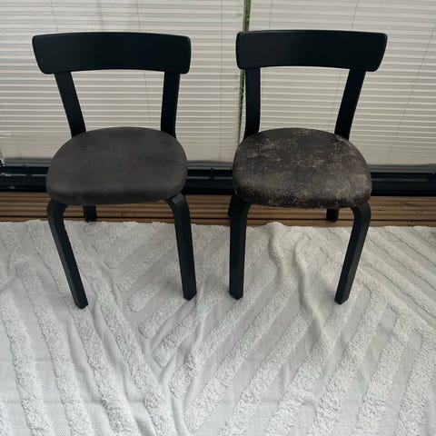 2 kpl Artek 69 tuoleja, tilaustyö, tilattu tehtaalta erityiskorkeana. Istuinkorkeus 54 cm. Hinta 145 e/kpl. Pinnoissa selkeää kulumaa, mutta hyvät käyttökuntoiset tuolit. Paljon pientä kulumajälkeä ja kolhua, ks. kuvat.