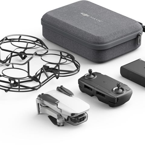 Mukaan tulee kaikki mitä fly more comboon sisältyy mm. Suojakehikko, 3x akkuja, drone, ohjain, useampi adapteri, säilytyslaukku.