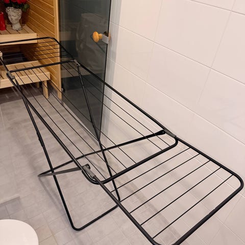 Olisko 170 cm korkea, tarkistusmittaan. Siisti, ehjä, ruosteeton. Ikean pystysuoraan avattava pyykkiteline.