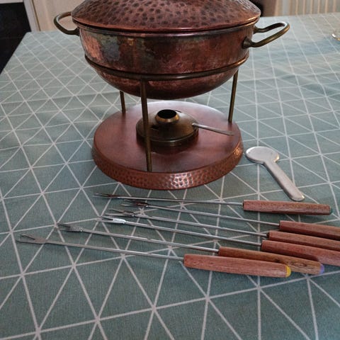 &Tradition Fondue-setti / glögipata kuparia, puukahvaiset haarukat
