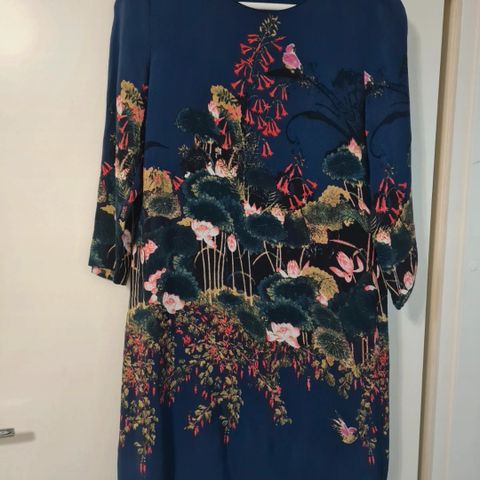 ESPRIT sininen sifonkimekko, koko 38/ M. Mekossa on kukkakuosi ja lyhyet hihat, joissa halkio. Vyötäröllä on koristerypytyksiä ja taakse solmittavat nauhat, selässä vetoketju. Mekossa on vuori hihoja lukuunottamatta. Pituus niskasta helmaan 100 cm.