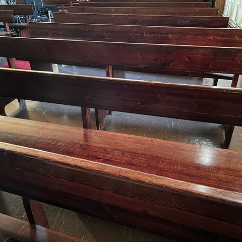 Käytetty kirkonpenkki, painava, pituus noin 2,75 m, ikäisekseen hyvä kunto