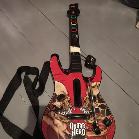 Kuvan mukainen täysin toimiva riffmaster kitara ja vastaanotin. Ei sisällä usb c latausjohtoa. Toimii playstation 4 ja 5 konsoleilla. Toimii myöa tietokoneella mutta whammy ja tilt vaatii erillisohjelman. Postitus onnistuu tarvittaessa.