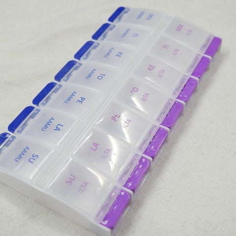 Läpinäkyvä lääkedosetti. Osasta päivät kuluneet pois. Eläintalous MMM, lisätietoja saa kysymällä