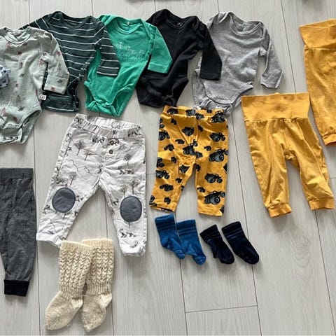 Valkoinen kauluspaita menee n.68cm ja varmaan pidempäänkin, samoin pikeepaita ehkä 68cm, mutta raitapaita, neule ja neuleliivi kannattaa kokeilla jo 62cm koossa tai miksi ei vastasyntyneellekin.