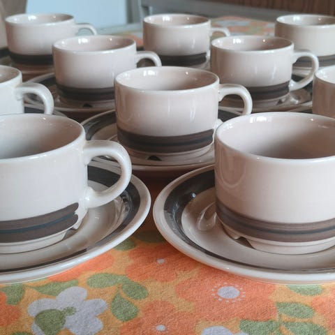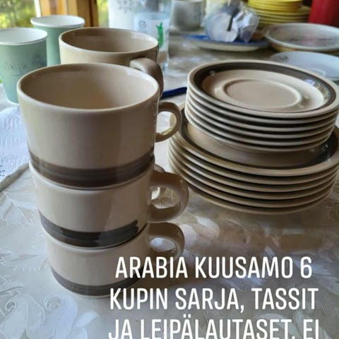 Arabian Kuusamo kahvikupit (4 kpl) ja asetit (6 kpl). Lisäksi halutessaan saa mukaan kaksi kuppia, joissa lohkeama (kuva 7).