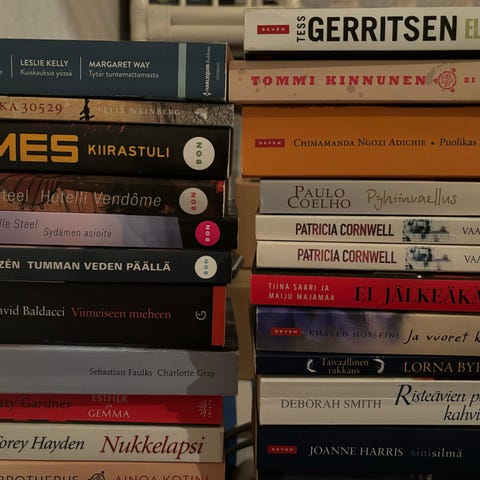 Myydään kasa pokkareita. Kaikki lukemattomia, mutta säilytyksessä osaan tullu "taitoksia", ks kuva 2. Myydään kaikki kerralla, yhteishinta.
