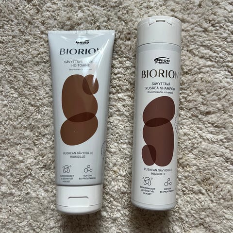 Biorion sävyttävä ruskea shampoo ja hoitoaine, molemmat 250ml. Uudet ja täysin käyttämättömät.