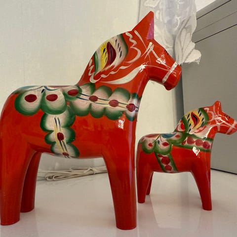 Myynnissä alkuperäisiä, käsintehtyjä ja käsinmaalattuja Taalainmaan puuhevosia Ruotsin Nusnäsistä. Valmistajat Nils Olsson ja G.A. Olsson, aitoustarrat tallella.