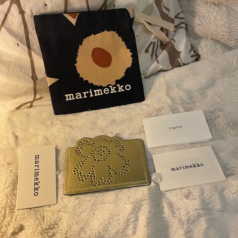 Uusi Marimekon Unikko korttikotelo lompakko. Pituus 10.5 cm, leveys 0.5 cm, korkeus 8 cm. Väriltään kauniin tummanruskea. Kuvassa näkyvä Marimekon pussukka tulee mukaan.