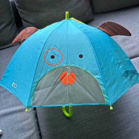 Täysin toimiva: tarra ok, menee kasaan, avausnappi toimii, värit säilyny ja sateenvarjossa oma pilli.