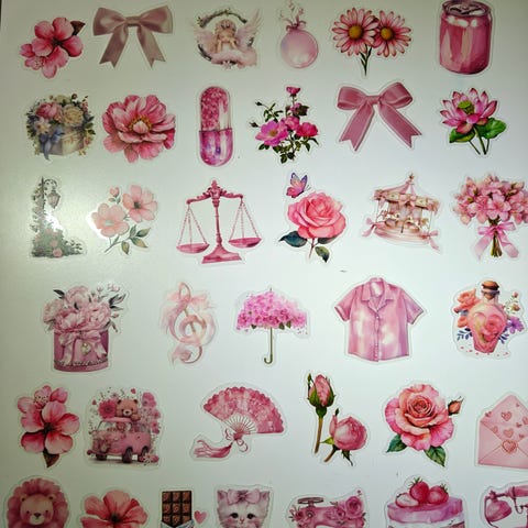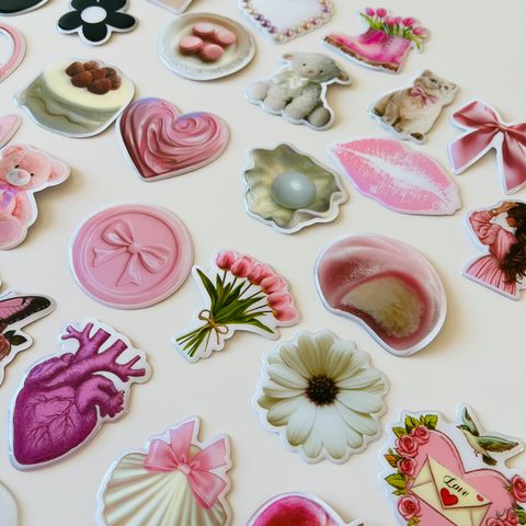 3D-tarrat, joissa on kesäaiheisia kuvioita, kuten kukkia ja perhosia ja tekstejä S U N sun , H O T hot, lahjapaketti , perhonen , kukka , Memory . Tarroissa on väreinä vaaleanpunaista, pinkkiä, violettia, vaaleansinistä ja valkoista, ja ne sisältävät koristeina rautalankaa, "timantteja" ja ohuita hopeanvärisiä painatuksia.