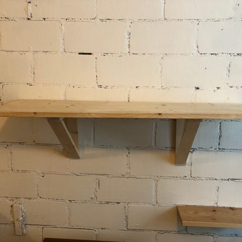 Valkoinen vanha seinähylly, josta saat hiomalla ja maalaamalla halutun värisen ja siistin. Maalipinnat kuluneet vuosien saatossa.