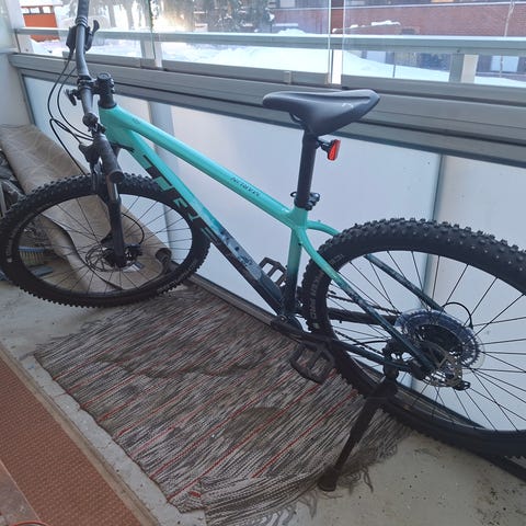Eli tällänen Rakenneltu Trekki ois kaupan eli just vaihettu Etuvanne (laatuvanne ohv oiskohan ollu 180€) sisuskumi ulkokumi etu jarrulevy ja etuakseli vikoina ois etuvaihtajan vaijeri ja keulan lockoutin vaijeri sekä vipu keulanahan toimii rockshokin ilmakeula ja muistaakseni edellinen omistaja vaihto vaihtajat rattaat yms aftermarketti osiin ja vaihteet eessä 2 ja takana 10 pikalukot renkaissa ja penkin säädössä grippeinä on tollaset yleismallin kiristettävät hyvä pyörä ku vähän laittaa
