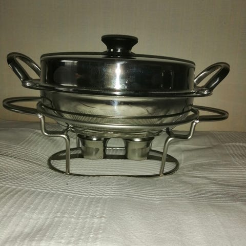 Iso pannu jossa voi lämmittää ruoan uunissa tai liedellä.. lämpö pysyy kynttilöiden avautua ja kansi päällä.. Upea ruokapöydän kattauksessa.