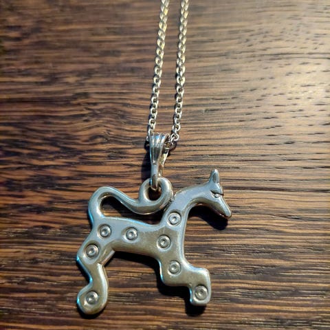Suomalainen 830H hopeariipus 1960–70-luvulta, Salovaaran tyyliä muistuttava. Hopeariipus on 43mm korkuinen ja 22mm levyinen ja siinä on 4 vaaleanpunaista zirkonia tai spinelliä, ei ketjua.